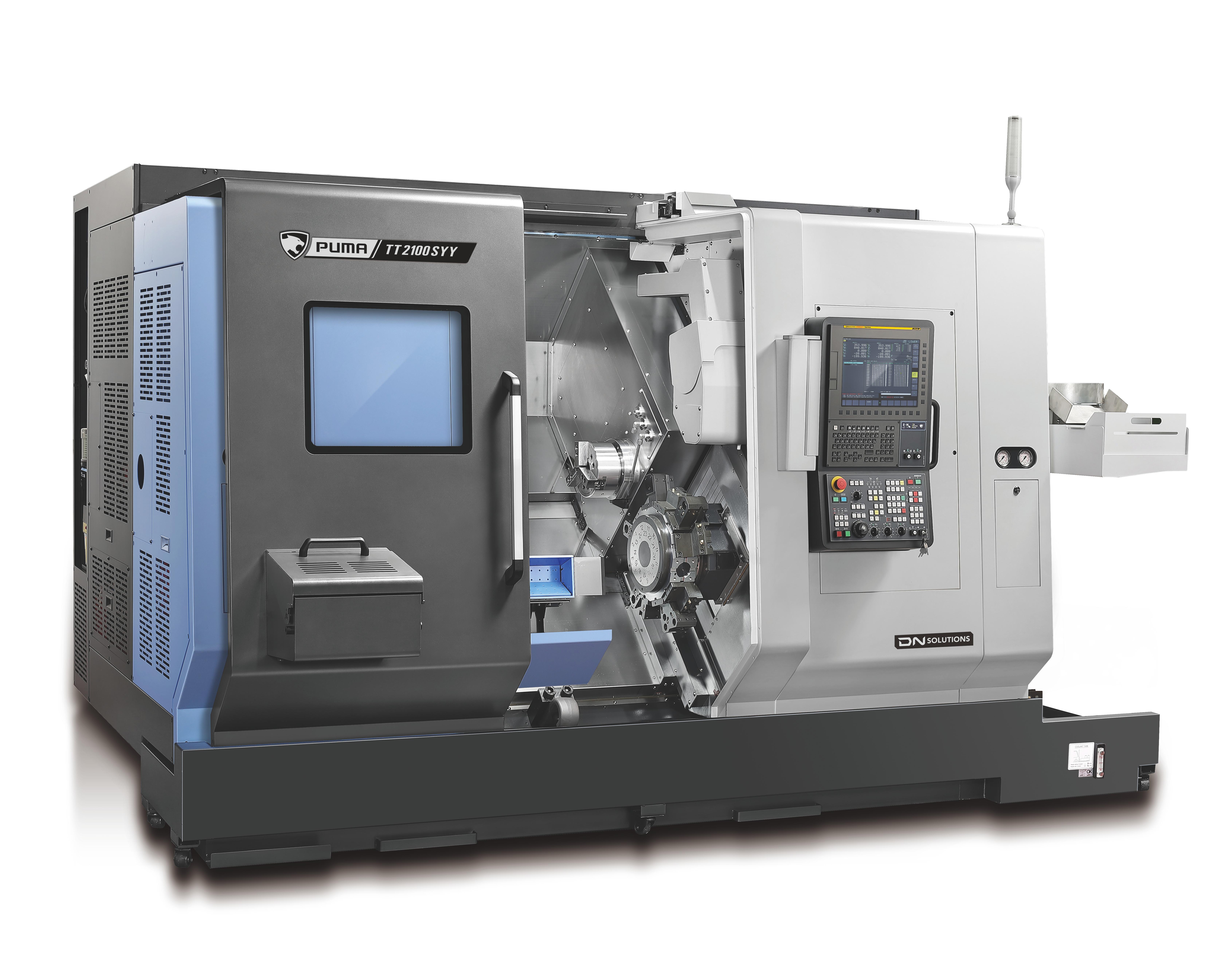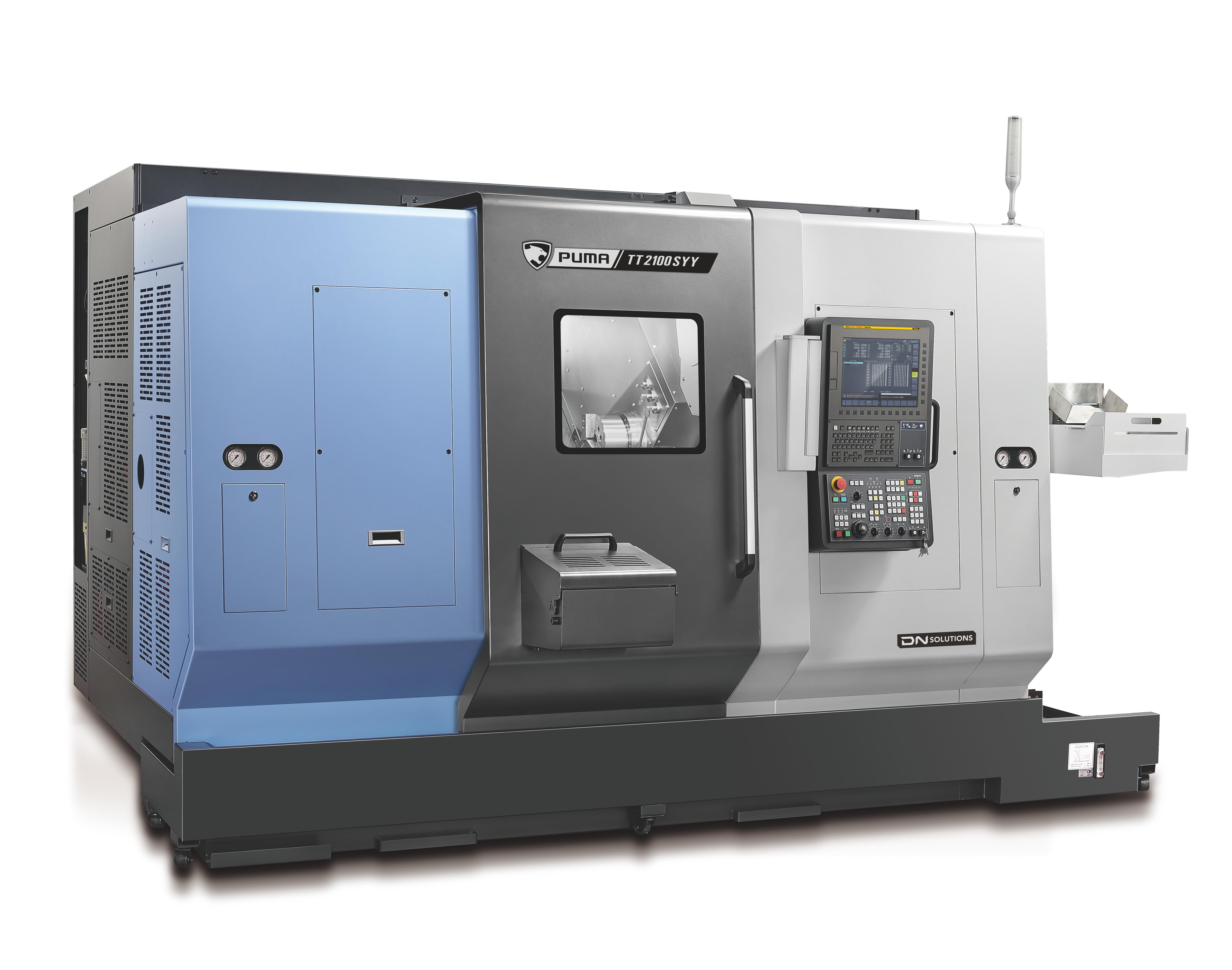 The PUMA TT1300, TT1800, TT2100, and TT2500 series are high-productivity horizontal turning centers with bar capacities ranging from 42mm to 81mm. These machines are equipped with twin opposed spindles and upper/lower turrets, featuring Y-axis capabilities for simultaneous two-face machining. Both spindles have equal power and capacity, allowing independent operation and automatic workpiece ejection, significantly enhancing productivity. Favored globally, the PUMA TT series is renowned for its best-in-class performance and reliability, making it one of DN Solutions' top-selling products. |